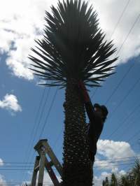 Imposing tree, eventually with dark massive trunk from flared base. Straight sharp narrow leaves festooned with fine hanging filaments, or threads, on the leaf edges. Grows well outdoors in New Zealand gardens.