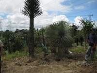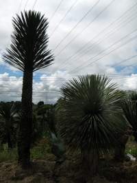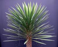Imposing tree, eventually with dark massive trunk from flared base. Straight sharp narrow leaves festooned with fine hanging filaments, or threads, on the leaf edges. Grows well outdoors in New Zealand gardens.