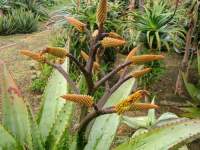 Spiny leafed tree Aloe slowly to 4m. Unbranching and massive rosette has large inflorescences of yellow flowers in outward pointing (45 degrees) racemes in mid-winter. Good in the garden.